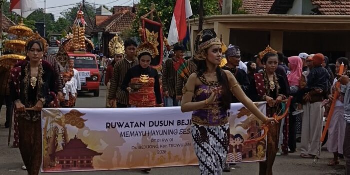 dentum.id, Mojokerto — Tradisi Ruwah Desa kembali digelar di Desa Bejijong, Kecamatan Trowulan, Kabupaten Mojokerto, Minggu (15/02/2026). Tahun ini, perayaan Ruwah Desa