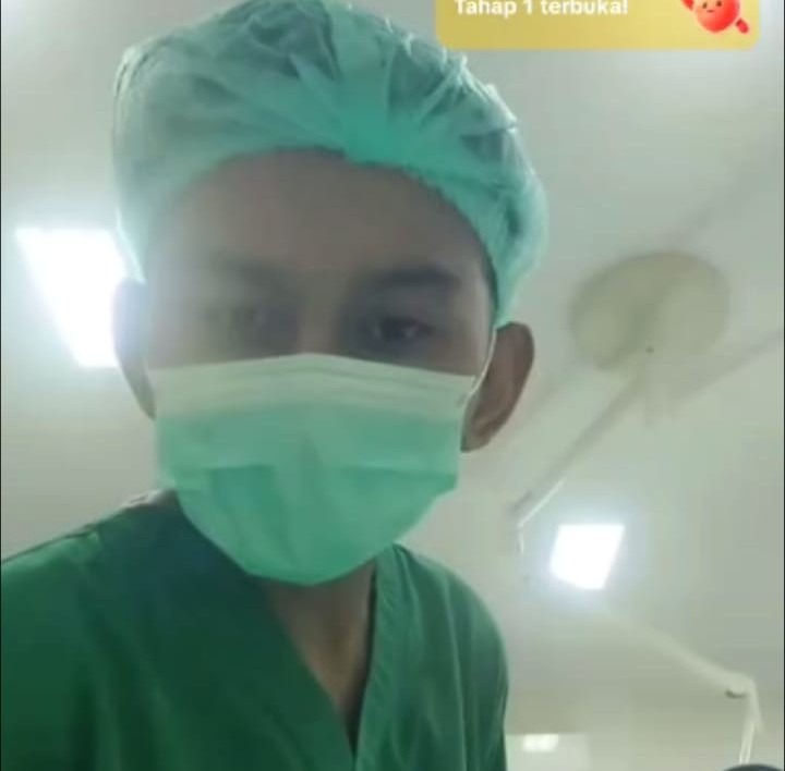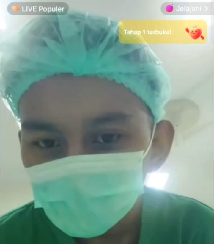 “Masih proses jahit, belum selesai. Nggak apa-apa sambil live, yang penting nggak kelihatan pasiennya,” ujar perawat pria dalam video tersebut.